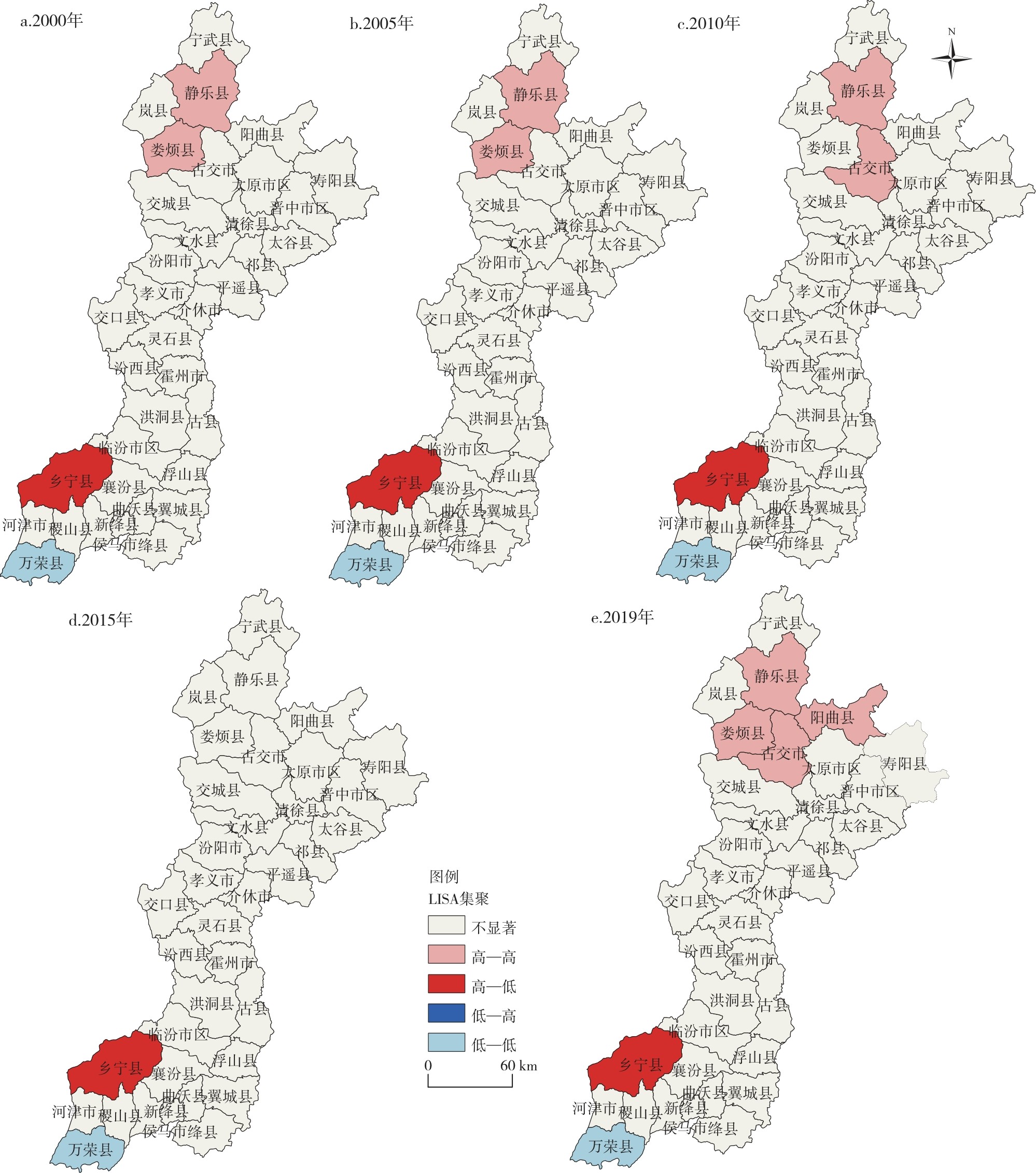 LISA Cluster map of ecological efficiency of counties in Fenhe River Basin from 2000 to 2019