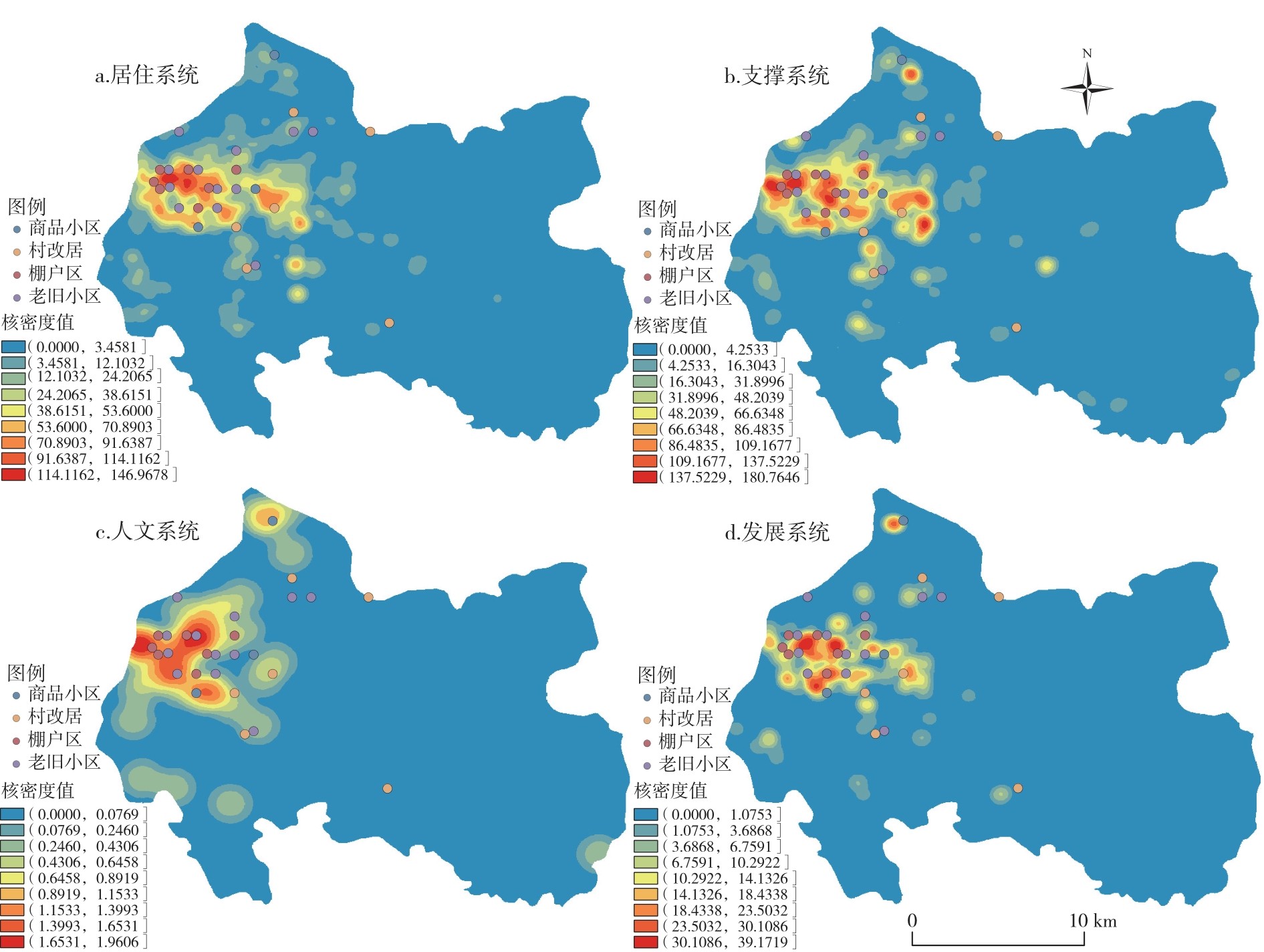 The kernel density distribution of the four major system facilities for human settlement in Yueyang Tower District